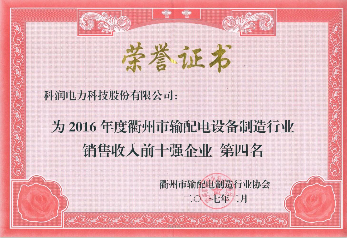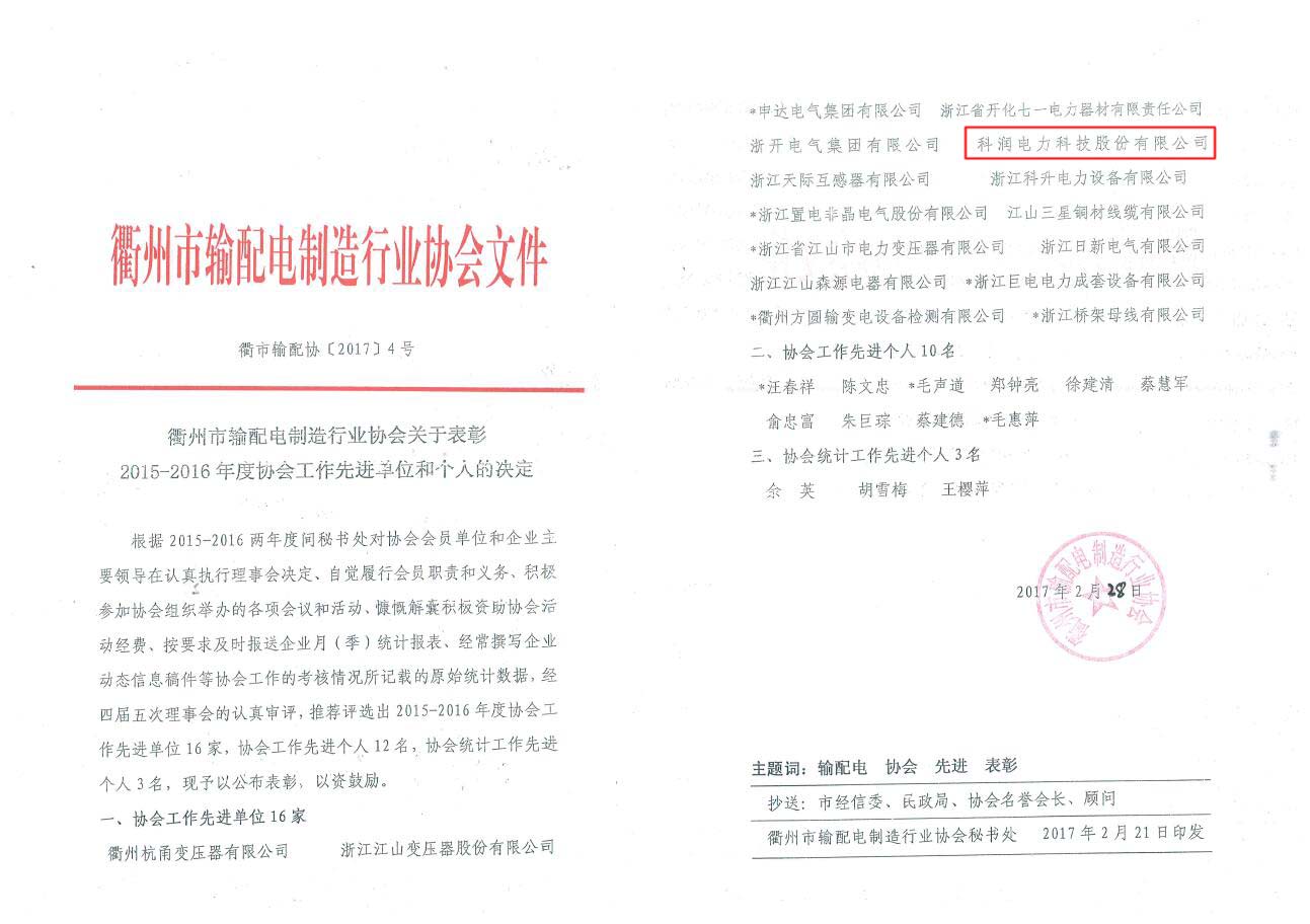 喜訊:恭賀公司榮獲衢州市輸配電制造行業協會年度工作先進單位、雙十強企業